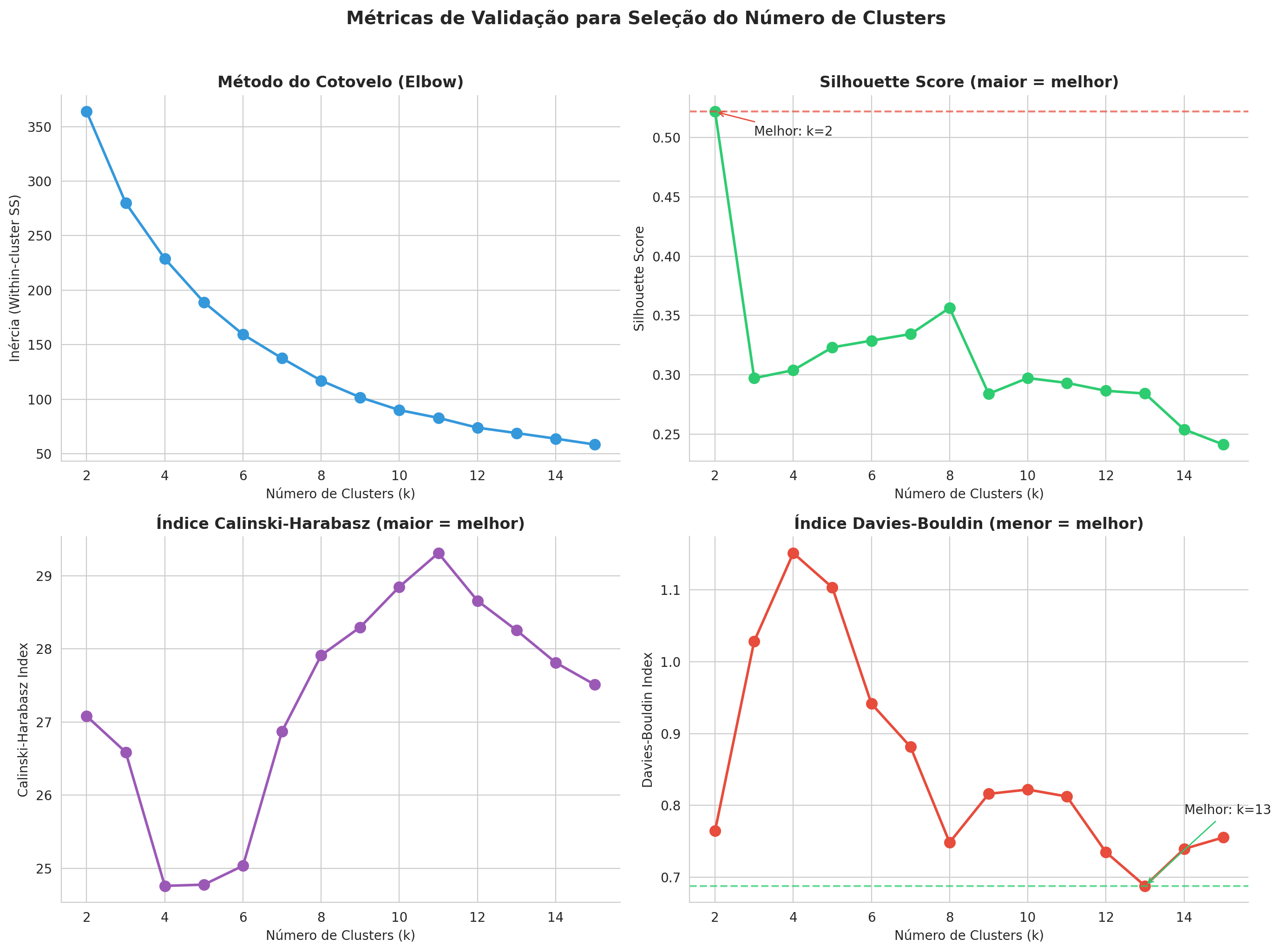 plt.suptitle('Métricas de Validação para Seleção do Número de Clusters', fontsize=14, fontweight='bold', y=1.02)