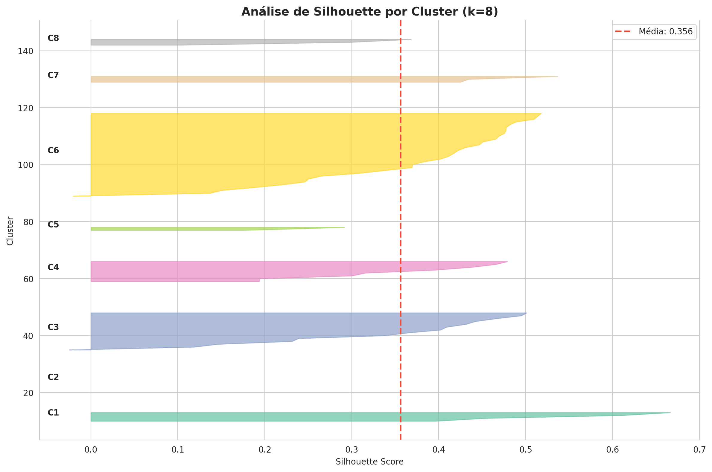 axes[0, 1].set_title('Silhouette Score (maior = melhor)', fontweight='bold')